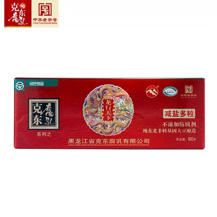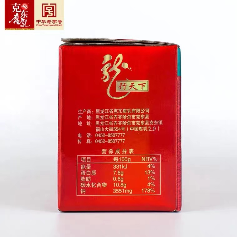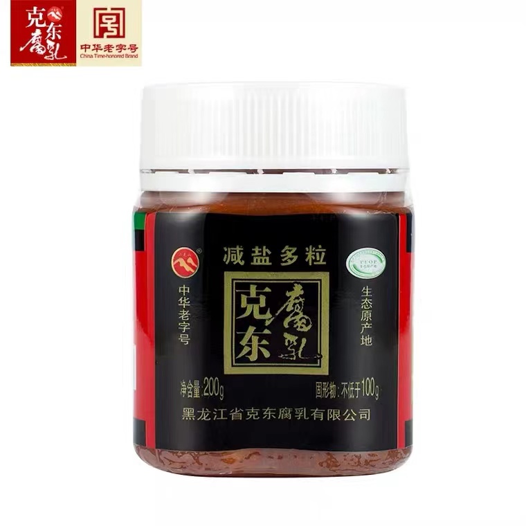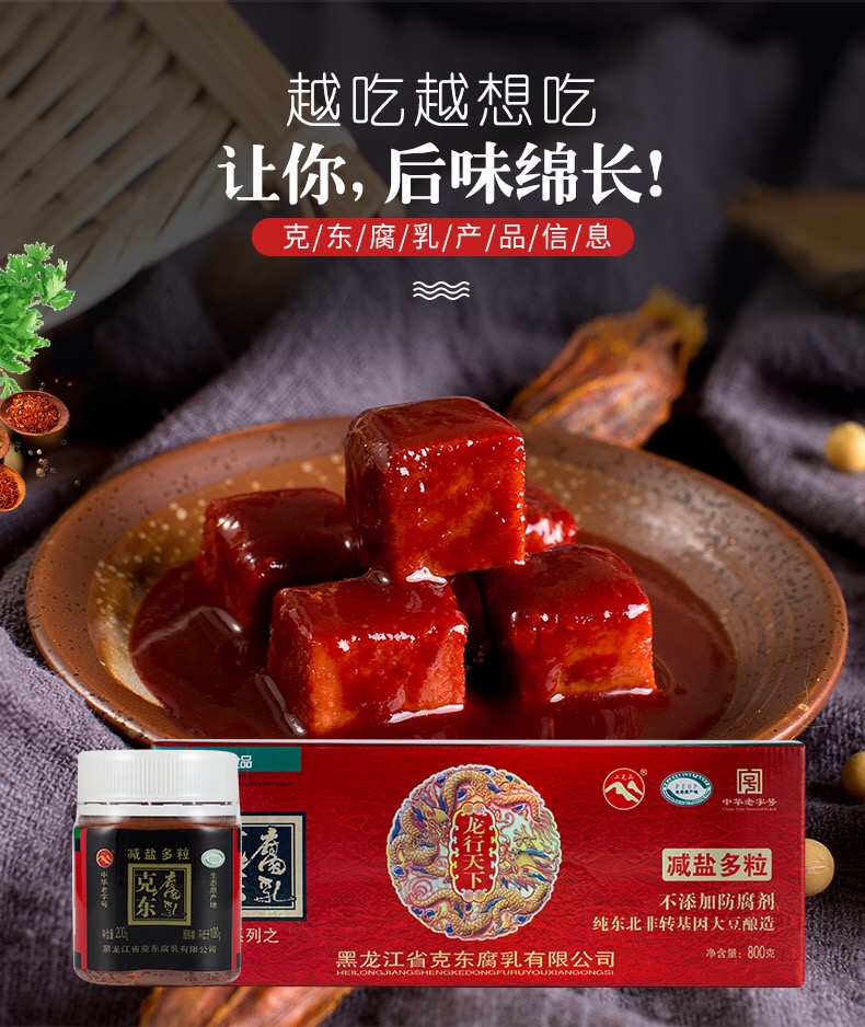 克东腐乳是一种传统的地方名特产品,始源于1915年,历史悠久、远近闻名。克东腐乳以地产含有丰富蛋白质的优质绿色大豆为主料,以大米、面粉、食盐为辅料,以十三味天然中划药为调香料,取用含有锶、锂、锌、碘、硒等稀有微量元素的清泉之水,采用独一无二的“微球菌”发酵技术,经三十多道工序、长达180天的发酵精心加工而成。产品不添加任何防腐剂和色素,将滋补与保健有机的融合在一起。克东腐乳含有18种人体所必须的氨基酸、维生素B1、B2、钙、铁、锌、硒等微量元素,且色鲜味美、柔软细腻、清新爽口、营养丰富,集品质优良和营养全