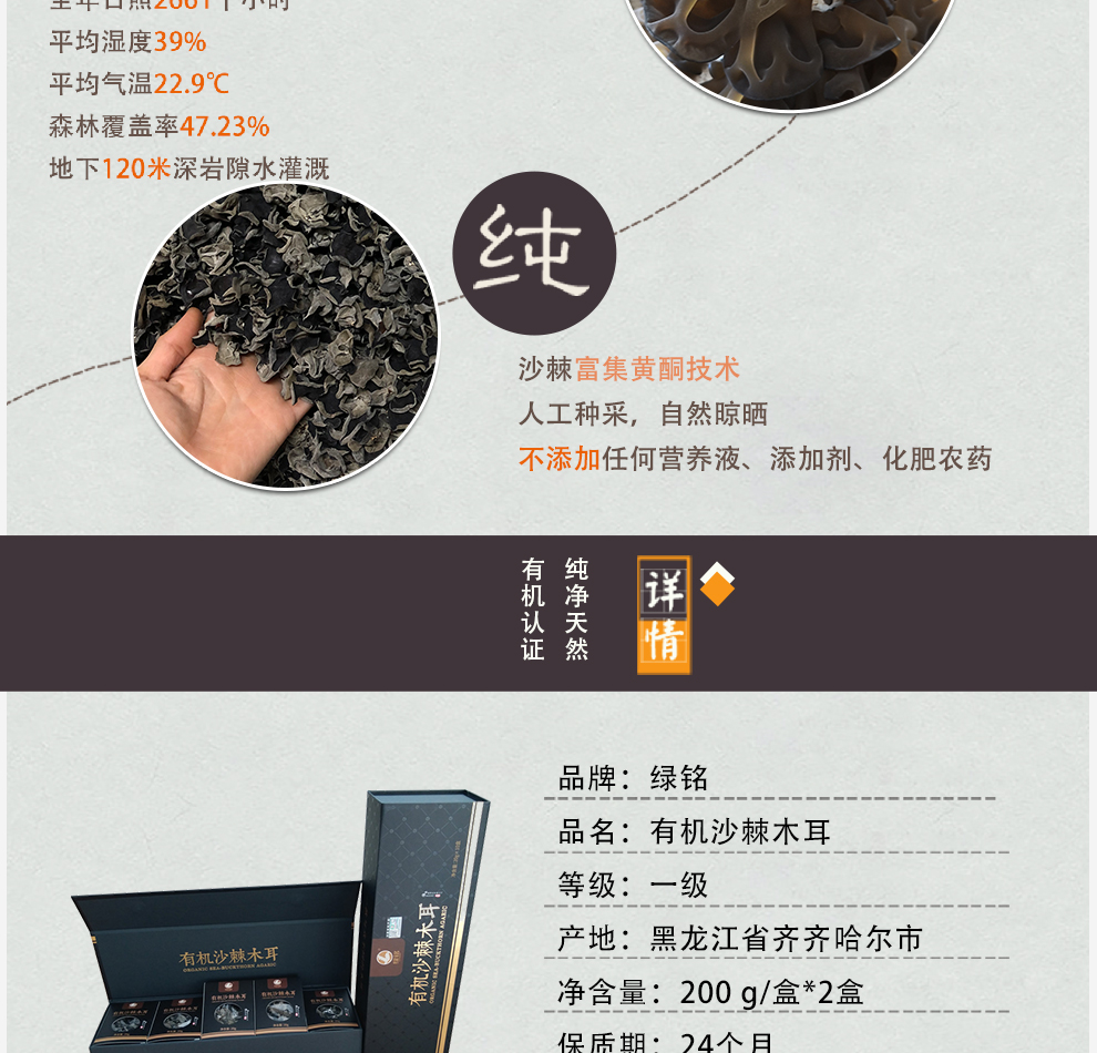 有机沙棘木耳黑色烟条礼盒 净含量:200g/盒*2盒