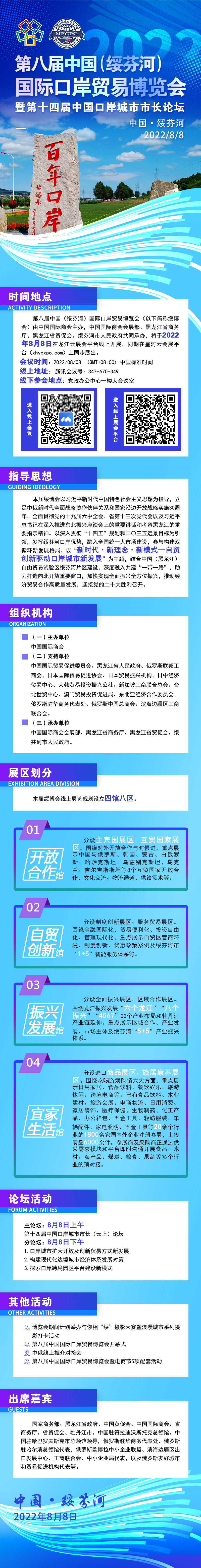 第八届中国(绥芬河)国际口岸贸易博览会暨第十四届中国口岸城市市长论坛,将于2022年8月8日在星河云会展平台(https://xhyexpo.com)线上举办。