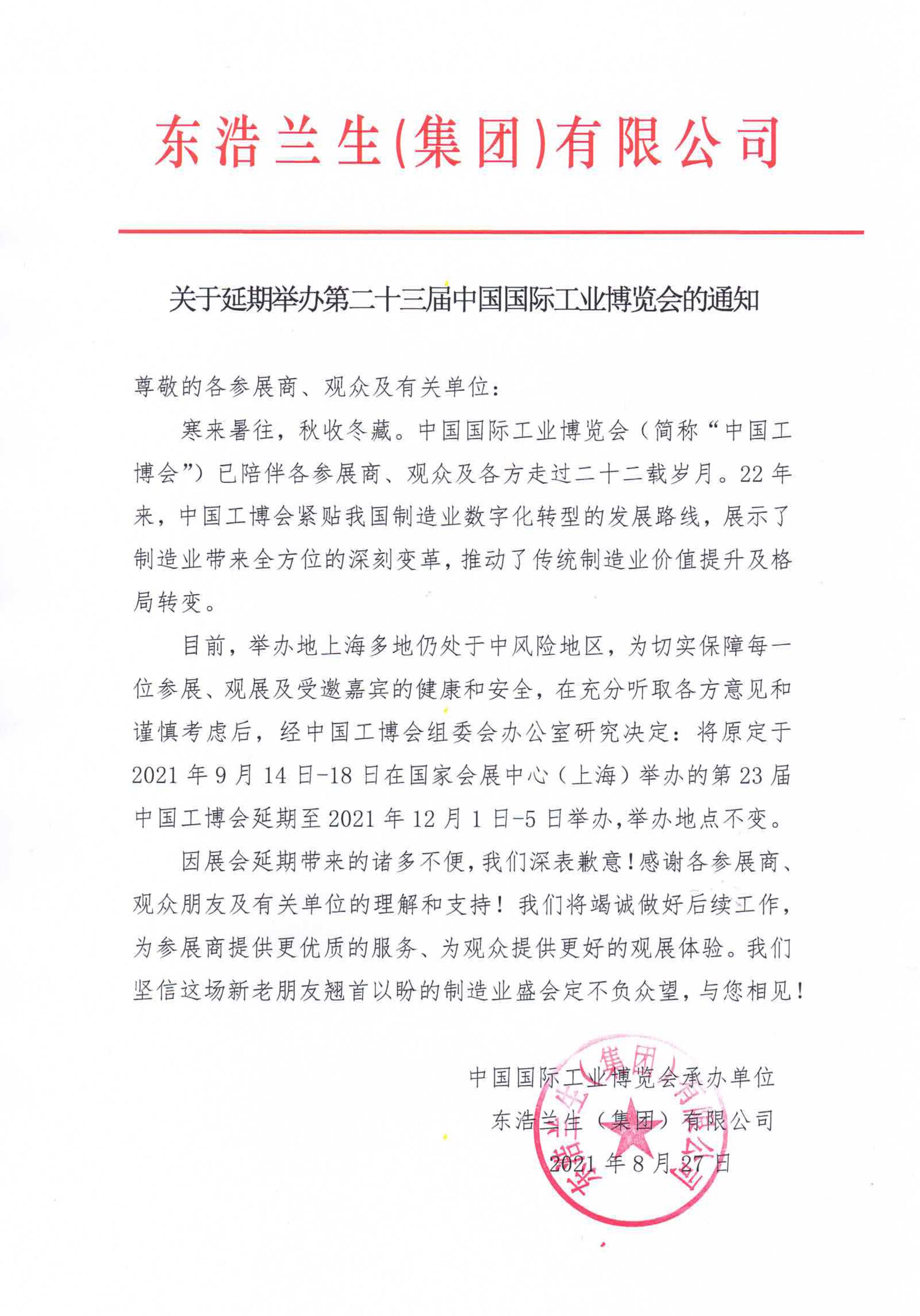 关于延期举办第二十三届中国国际工业博览会的通知