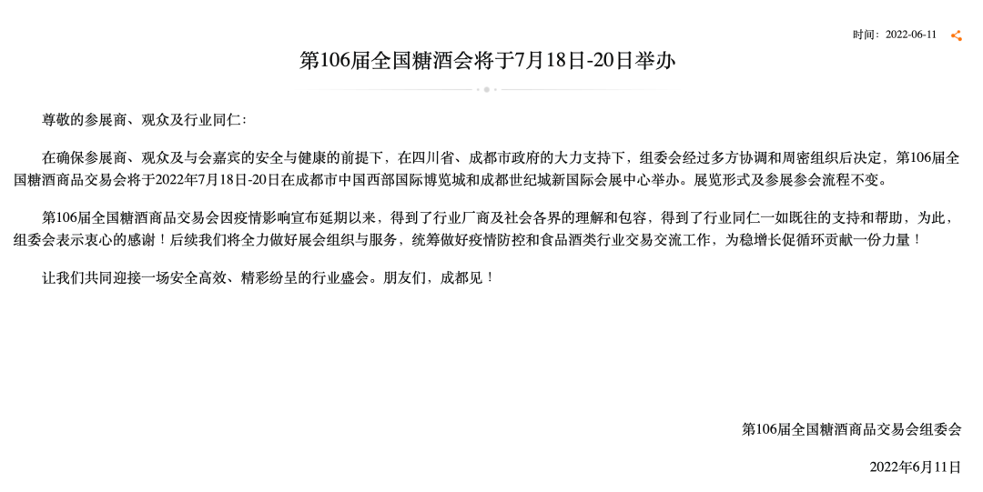 第106届全国糖酒商品交易会将于2022年7月18日至20日在成都举办